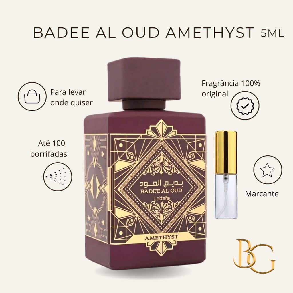 Descubra o Badee Al Oud Amethysth em versão decant de 5ml, ideal para experimentar a fragrância ou ter praticidade no dia a dia.