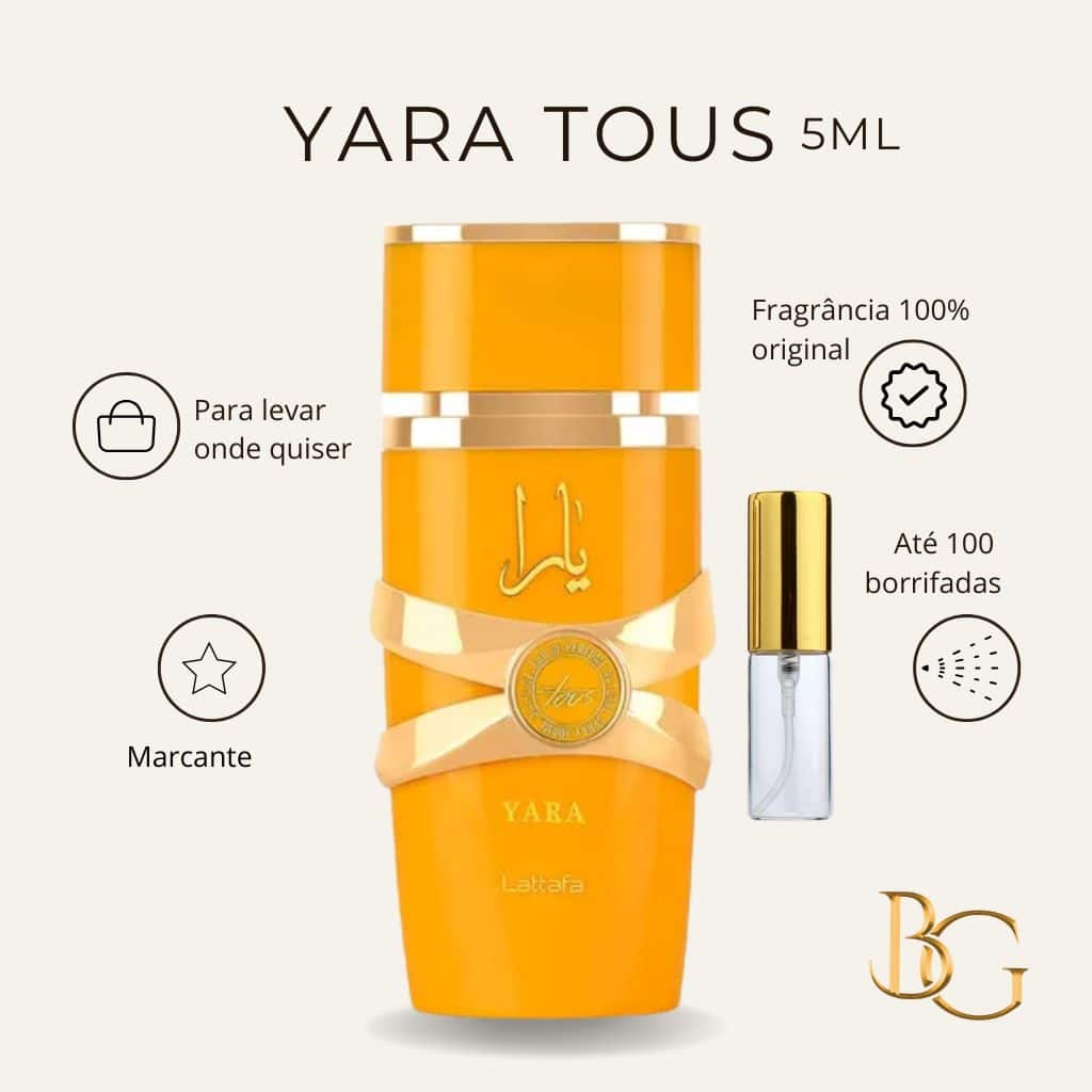 O Lattafa Yara Tous Eau de Parfum na versão decant 5ml é perfeito para quem deseja experimentar essa fragrância tropical e feminina antes de comprar o frasco completo. Seu aroma combina notas frutadas, florais e um fundo cremoso de baunilha, criando um perfume doce, elegante e envolvente. Ideal para levar na bolsa ou usar no dia a dia.