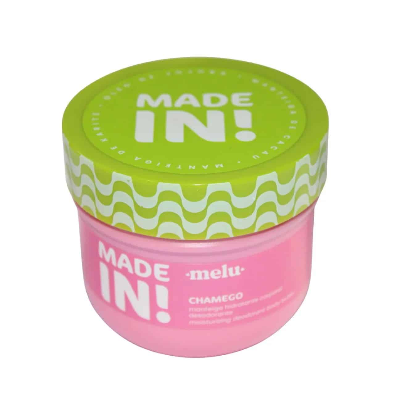A Manteiga Hidratante Corporal Desodorante Chamego Made In! Melu by Ruby Rose é uma manteiga corporal rica, cremosa e perfumada, ideal para uso diário. Enriquecida com manteiga de cacau e manteiga de karité, oferece hidratação profunda, reparação da pele e toque aveludado, enquanto o óleo de jojoba garante elasticidade, ação antioxidante e equilíbrio da barreira cutânea