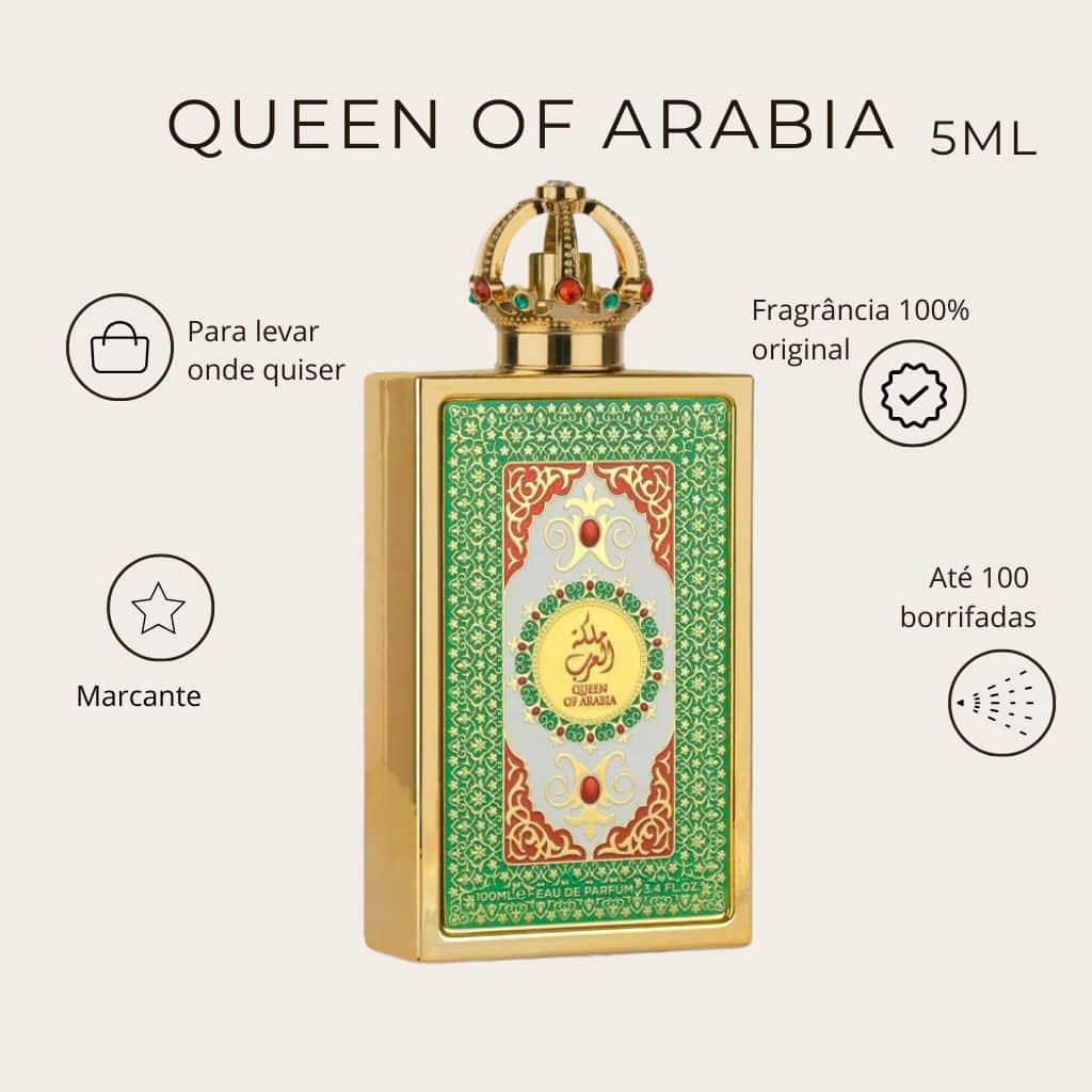 Descubra a elegância e o charme do perfume Queen Of Arabia da Lattafa, uma fragrância feminina marcante em versão prática de 5ml. Ideal para quem busca um aroma sofisticado para o dia a dia ou ocasiões especiais.