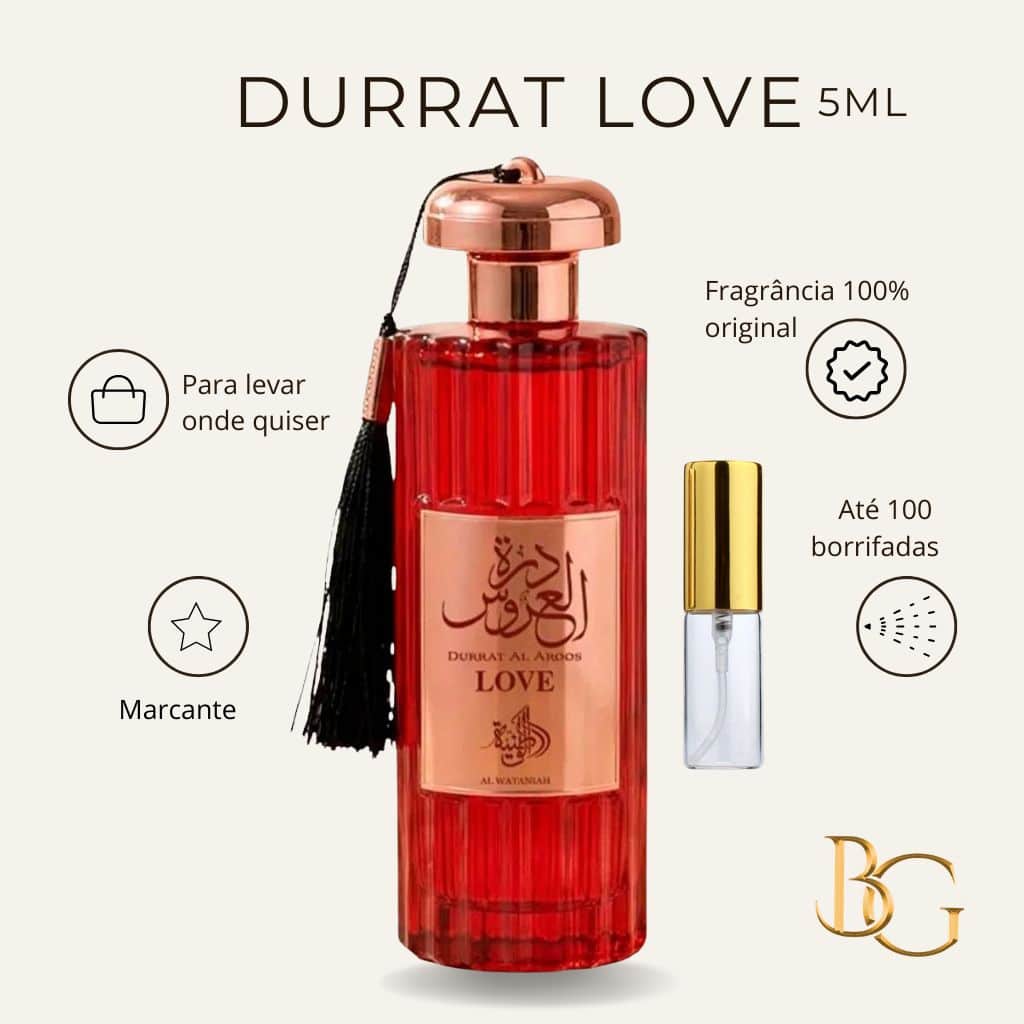 Com inspiração na perfumaria árabe de luxo, o Durrat Love combina notas suaves e adocicadas que transmitem romantismo, elegância e sensualidade, tornando-se ideal tanto para o dia a dia quanto para momentos especiais. Sua excelente fixação e projeção garantem um perfume presente por horas, mesmo em pequenas quantidades.