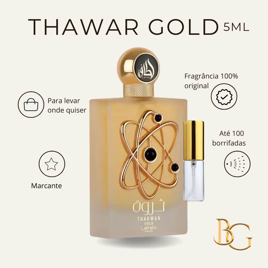 O Perfume Tharwah Gold Lattafa 5ml é ideal para quem deseja conhecer a fragrância ou levar consigo em um formato compacto e prático.