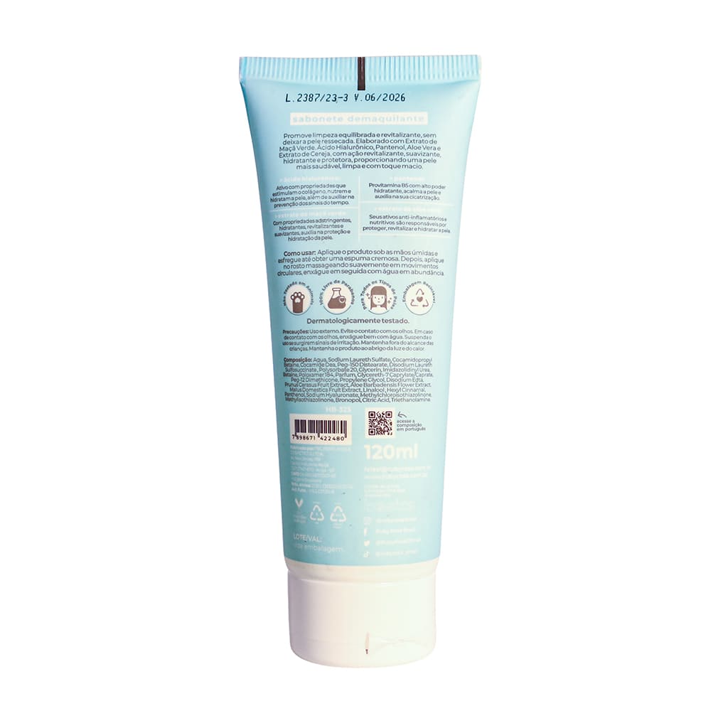 O sabonete demaquilante da linha Basics remove a maquiagem de forma prática e rápida, composto por extratos de maçã verde, aloe vera, ácido hialurônico, pantenol e extrato de cereja, promove limpeza sem agredir à pele.